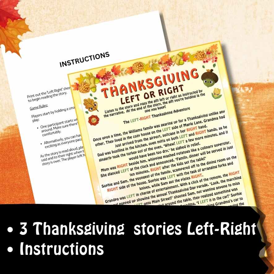 Make your Thanksgiving gathering even more memorable with our Thanksgiving Left Right Gratitude Game! This family-friendly, gift-passing game adds a touch of warmth, fun, and togetherness as participants pass a gift to the left or right based on a captivating story filled with thankfulness and surprises. Who will end up with the special prize? The anticipation and laughter will keep everyone engaged from start to finish!