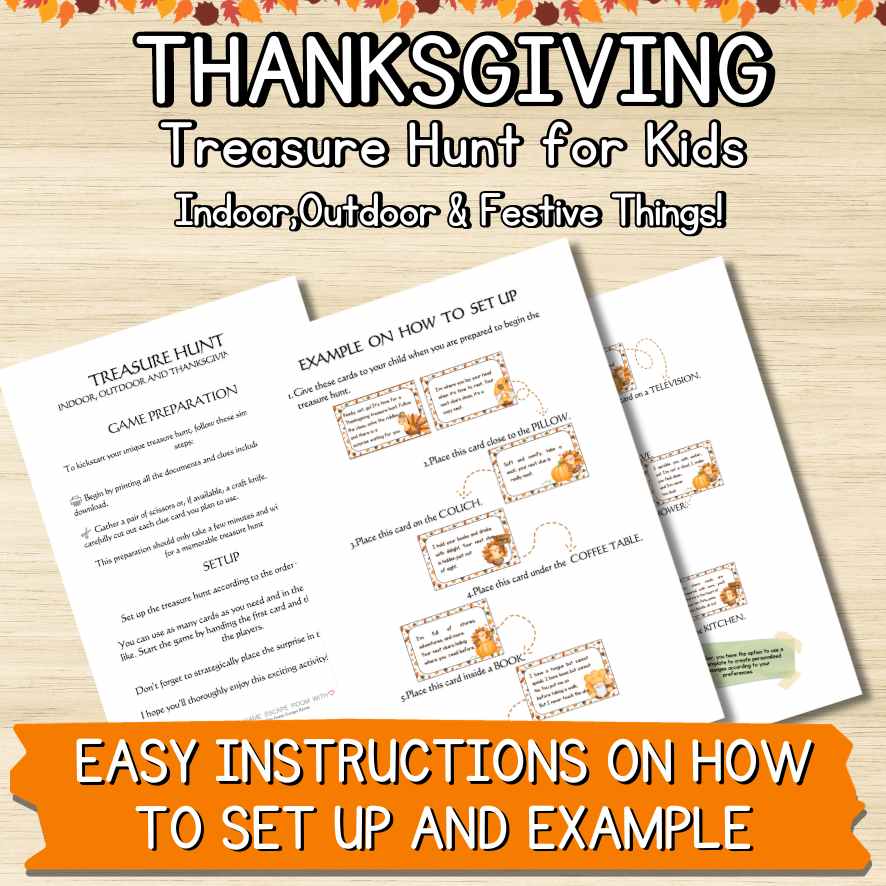 Our clues are age-appropriate and crafted to engage children in a delightful journey that takes them all over your living space and yard. The "treasure" at the end can be whatever you wish—treats, toys, stickers, or even a special Thanksgiving keepsake.
