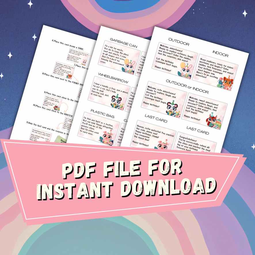 Transform any celebration into an extraordinary adventure with our Cute Birthday Treasure Hunt Kit! Designed for both indoor and outdoor play, this kit comes packed with 60 delightful riddle clues that will engage children and teens as they explore every corner of your home and garden. Perfect for birthdays, parties, or unique gift reveals, this treasure hunt kit brings an exciting twist to any special occasion.